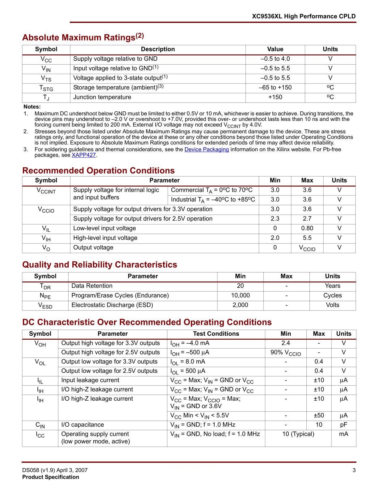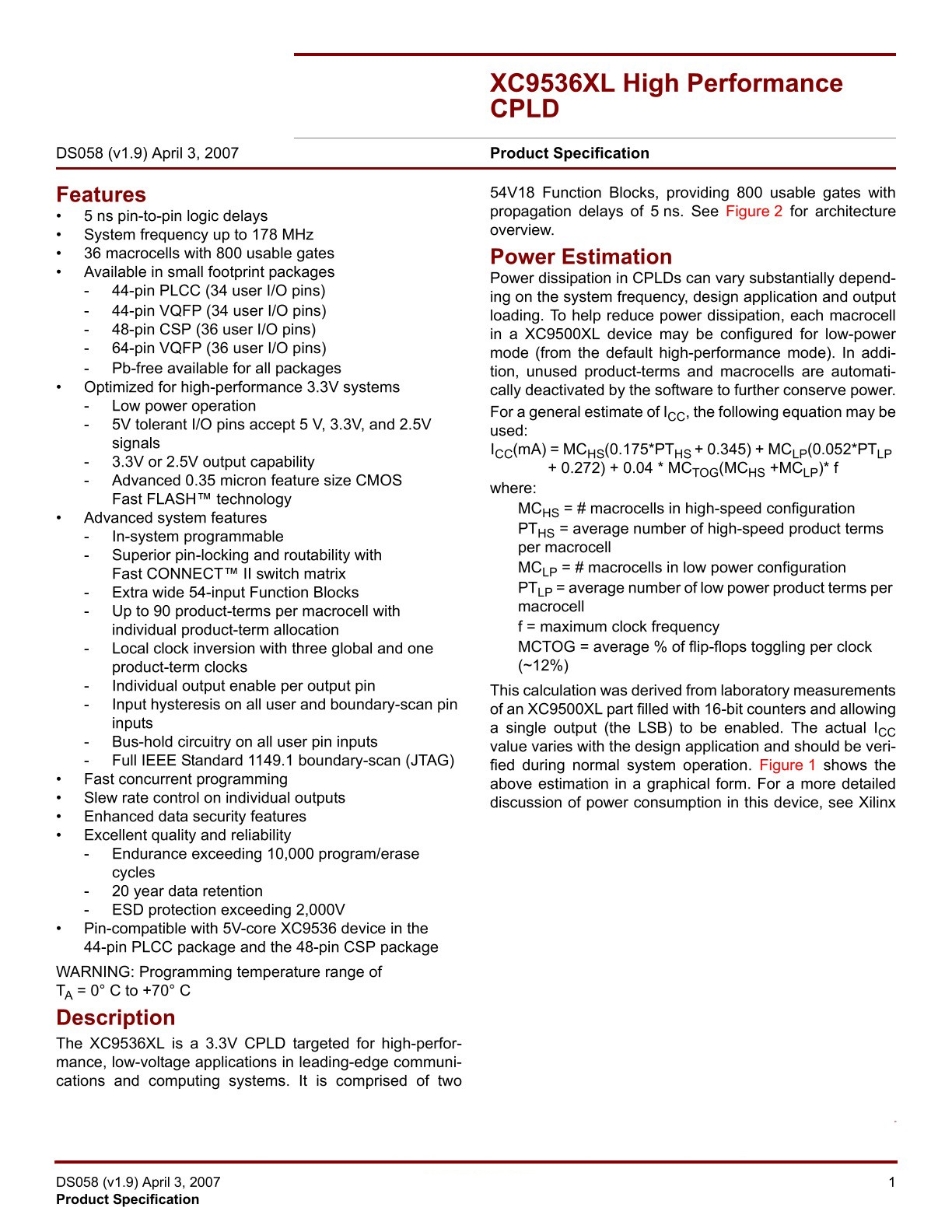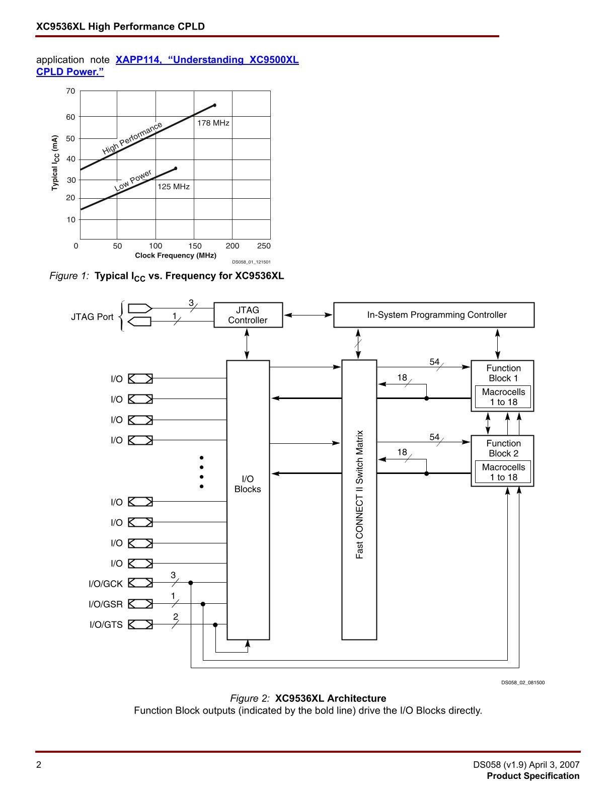 Description The XC9572 is a high-performance CPLD providing advanced in-system programming and test capabilities for general purpose logic integration. It is comprised of four 36V18 Function Blocks, providing 1,600 usable gates with propagation delays of 7.5 ns. See Figure2for the architecture overview. Features • 7.5 ns pin-to-pin logic delays on all pins • fCNT to 125 MHz • 72 macrocells with 1,600 usable gates • Up to 72 user I/O pins • 5 V in-system programmable (ISP) - Endurance of 10,000 program/erase cycles - Program/erase over full commercial voltage and temperature range • Enhanced pin-locking architecture • Flexible 36V18 Function Block - 90 product terms drive any or all of 18 macrocells within Function Block - Global and product term clocks, output enables, set and reset signals • Extensive IEEE Std 1149.1 boundary-scan (JTAG) support • Programmable power reduction mode in each macrocell • Slew rate control on individual outputs • User programmable ground pin capability • Extended pattern security features for design protection • High-drive 24 mA outputs • 3.3 V or 5 V I/O capability • Advanced CMOS 5V FastFLASH technology • Supports parallel programming of more than one XC9500 concurrently • Available in 44-pin PLCC, 84-pin PLCC, 100-pin PQFP and 100-pin TQFP packages |