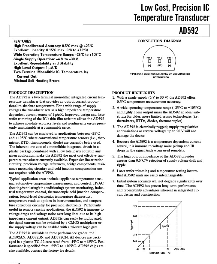 The AD592 is a two terminal monolithic integrated circuit temperature transducer that provides an output current proportional to absolute temperature. For a wide range of supply voltages the transducer acts as a high impedance temperature dependent current source of 1 µA/K. Improved design and laser wafer trimming of the IC’s thin film resistors allows the AD592 to achieve absolute accuracy levels and nonlinearity errors previously unattainable at a comparable price.