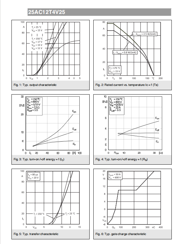 • Dynamic test results for Vcc = 600V, RGon/off = 12Ω, Ic = 50A, VGE = ±15V: Eon= 5.6mJ, Eoff = 6.1mJ, Err = 3.3mJ, di/dton = 1440A/µs, tdon = 58ns, tr = 43ns, di/dtoff = 600A/µs, tdoff = 370ns, tf = 65ns