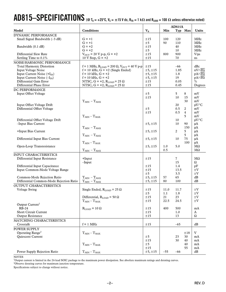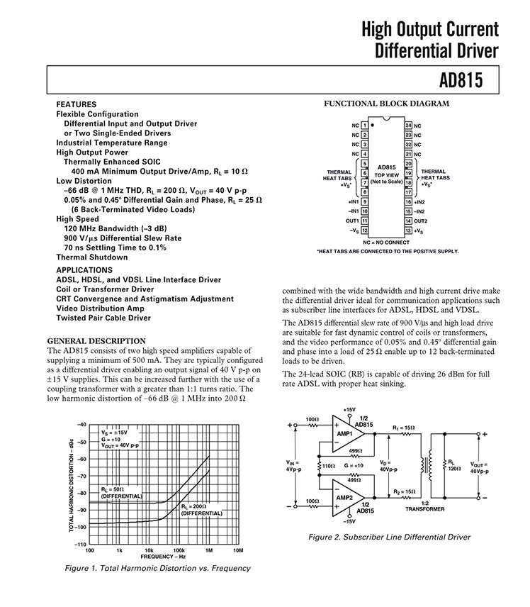 The AD815 consists of two high speed amplifiers capable of supplying a minimum of 500 mA. They are typically configured as a differential driver enabling an output signal of 40 V p-p on ±15 V supplies. This can be increased further with the use of a coupling transformer with a greater than 1:1 turns ratio. The low harmonic distortion of –66 dB @ 1 MHz into 200 Ω combined with the wide bandwidth and high current drive make the differential driver ideal for communication applications such as subscriber line interfaces for ADSL, HDSL and VDSL.