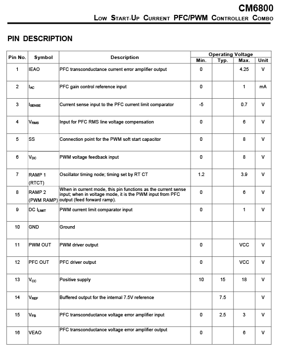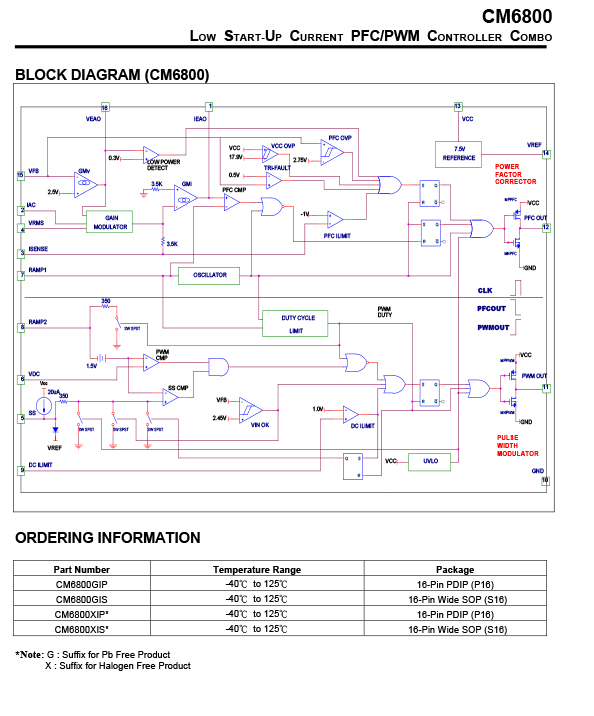 CM6800 includes circuits for the implementation of leading edge, average current, “boost” type power factor correction and a trailing edge, pulse width modulator (PWM). Gate-driver with 1A capabilities minimizes the need for external driver circuits. Low power requirements improve efficiency and reduce component costs.