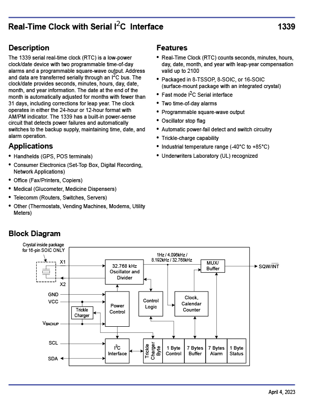 | Features | Alarm, Leap Year, Square Wave Output, Trickle-Charger |