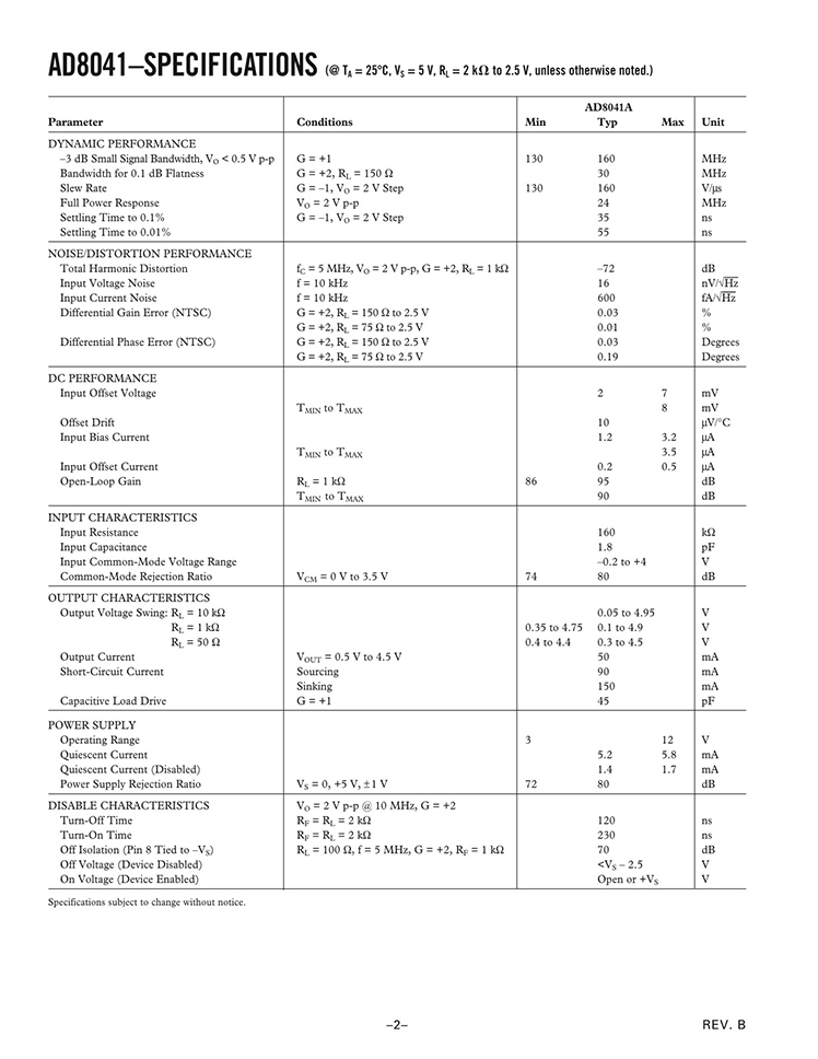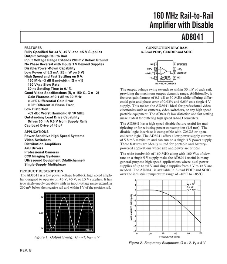 PRODUCT DESCRIPTION The AD8041 is a low power voltage feedback, high speed amplifier designed to operate on +3 V, +5 V, or ±5 V supplies. It has true single-supply capability with an input voltage range extending 200 mV below the negative rail and within 1 V of the positive rail. The output voltage swing extends to within 50 mV of each rail, providing the maximum output dynamic range. Additionally, it features gain flatness of 0.1 dB to 30 MHz while offering differential gain and phase error of 0.03% and 0.03° on a single 5 V supply. This makes the AD8041 ideal for professional video electronics such as cameras, video switchers, or any high speed portable equipment. The AD8041’s low distortion and fast settling make it ideal for buffering high speed A-to-D converters. FEATURES Fully Specified for +3 V, +5 V, and ±5 V Supplies Output Swings Rail to Rail Input Voltage Range Extends 200 mV Below Ground No Phase Reversal with Inputs 1 V Beyond Supplies Disable/Power-Down Capability Low Power of 5.2 mA (26 mW on 5 V) High Speed and Fast Settling on 5 V: 160 MHz –3 dB Bandwidth (G = +1) 160 V/μs Slew Rate 30 ns Settling Time to 0.1% Good Video Specifications (RL = 150 Ω, G = +2) Gain Flatness of 0.1 dB to 30 MHz 0.03% Differential Gain Error 0.03° Differential Phase Error Low Distortion –69 dBc Worst Harmonic @ 10 MHz Outstanding Load Drive Capability Drives 50 mA 0.5 V from Supply Rails Cap Load Drive of 45 pF APPLICATIONS Power Sensitive High Speed Systems Video Switchers Distribution Amplifiers A/D Drivers Professional Cameras CCD Imaging Systems Ultrasound Equipment (Multichannel) Single-Supply Multiplexer |