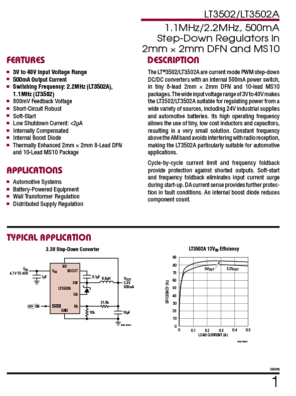 DESCRIPTION The LT®3509 is a dual, current mode, step-down switching regulator, with internal power switches each capable of providing 700mA output current. This regulator provides a compact and robust solution for multi-rail systems in harsh environments. It incorporates several protection features including overvoltage lockout and cycle-by-cycle current limit. Thermal shutdown provides additional protection. FEATURES Two 700mA Switching Regulators with Internal Power Switches Wide 3.6V to 36V Operating Range Overvoltage Lockout Protects Circuit Through 60V Supply Transients Short-Circuit Robust Low Dropout Voltage: 95% Maximum Duty Cycle Adjustable 300kHz to 2.2MHz Switching Frequency Synchronizable Over the Full Range Uses Small Inductors and Ceramic Capacitors ntegrated Boost Diodes nternal Compensation Thermally Enhanced 14-Lead (4mm × 3mm) DFN and 16 Lead MSOP Packages APPLICATIONS Automotive Electronics Industrial Controls Wall Transformer Regulation Networking Devices CPU, DSP, or FPGA Power |
