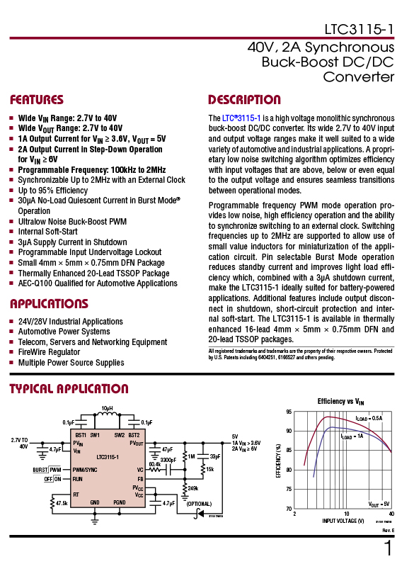 DescripTion The LTC®3115-1 is a high voltage monolithic synchronous buck-boost DC/DC converter.Its wide2.7Vto40Vinput and output voltage ranges make it well suited to a wide variety of automotive and industrial applications. A proprietary low noise switching algorithm optimizes efficiency with input voltages that are above, below or even equal to the output voltage and ensures seamless transitions between operational modes. FeaTures ● Wide VIN Range: 2.7V to 40V ● Wide VOUT Range: 2.7V to 40V ● 1A Output Current for VIN ≥ 3.6V, VOUT = 5V ● 2A Output Current in Step-Down Operation for VIN ≥ 6V ● Programmable Frequency: 100kHz to 2MHz ● Synchronizable Up to 2MHz with an External Clock ● Up to 95 Efficiency ● 30µA No-Load Quiescent Current in Burst Mode® Operation ● Ultralow Noise Buck-Boost PWM ● Internal Soft-Start ● 3µA Supply Current in Shutdown ● Programmable Input Undervoltage Lockout ● Small 4mm × 5mm × 0.75mm DFN Package ● Thermally Enhanced 20-Lead TSSOP Package applicaTions ● 24V/28V Industrial Applications ● Automotive Power Systems ● Telecom, Servers and Networking Equipment ● FireWire Regulator ● Multiple Power Source Supplies |