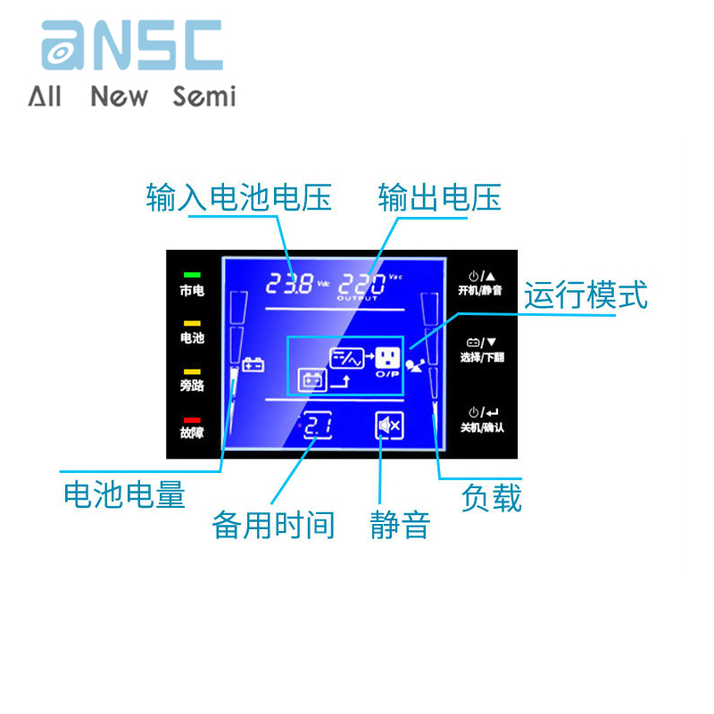 | LED indicator light | Load size, battery capacity, mains mode, battery mode, bypass mode, fault indication |