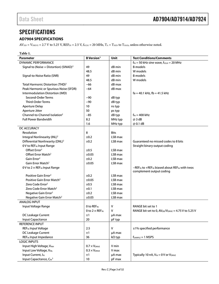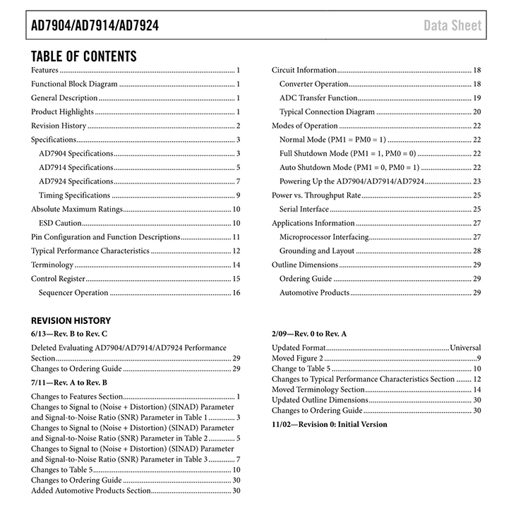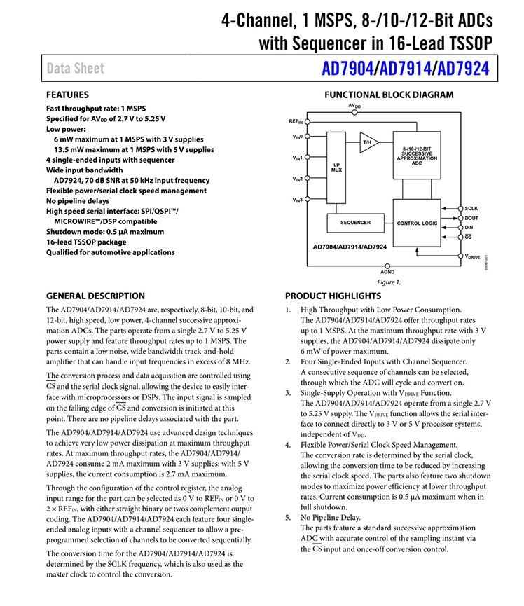 GENERAL DESCRIPTION The AD7904/AD7914/AD7924 are, respectively, 8-bit, 10-bit, and 12-bit, high speed, low power, 4-channel successive approximation ADCs. The parts operate from a single 2.7 V to 5.25 V power supply and feature throughput rates up to 1 MSPS. The parts contain a low noise, wide bandwidth track-and-hold amplifier that can handle input frequencies in excess of 8 MHz. FEATURES Fast throughput rate: 1 MSPS Specified for AVDD of 2.7 V to 5.25 V Low power: 6 mW maximum at 1 MSPS with 3 V supplies 13.5 mW maximum at 1 MSPS with 5 V supplies 4 single-ended inputs with sequencer Wide input bandwidth AD7924, 70 dB SNR at 50 kHz input frequency Flexible power/serial clock speed management No pipeline delays High speed serial interface: SPI/QSPI™/ MICROWIRE™/DSP compatible Shutdown mode: 0.5 µA maximum 16-lead TSSOP package Qualified for automotive applications |
