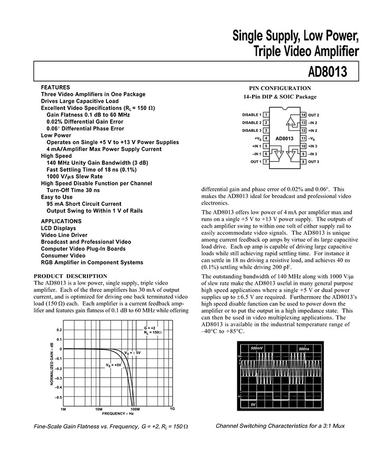 PRODUCT DESCRIPTION The AD8013 is a low power, single supply, triple video amplifier. Each of the three amplifiers has 30 mA of output current, and is optimized for driving one back terminated video load (150 Ω) each. Each amplifier is a current feedback amplifier and features gain flatness of 0.1 dB to 60 MHz while offering differential gain and phase error of 0.02% and 0.06°. This makes the AD8013 ideal for broadcast and professional video electronics. FEATURES Three Video Amplifiers in One Package Drives Large Capacitive Load Excellent Video Specifications (RL = 150 V) Gain Flatness 0.1 dB to 60 MHz 0.02% Differential Gain Error 0.06° Differential Phase Error Low Power Operates on Single +5 V to +13 V Power Supplies 4 mA/Amplifier Max Power Supply Current High Speed 140 MHz Unity Gain Bandwidth (3 dB) Fast Settling Time of 18 ns (0.1%) 1000 V/ms Slew Rate High Speed Disable Function per Channel Turn-Off Time 30 ns Easy to Use 95 mA Short Circuit Current Output Swing to Within 1 V of Rails APPLICATIONS LCD Displays Video Line Driver Broadcast and Professional Video Computer Video Plug-In Boards Consumer Video RGB Amplifier in Component Systems |