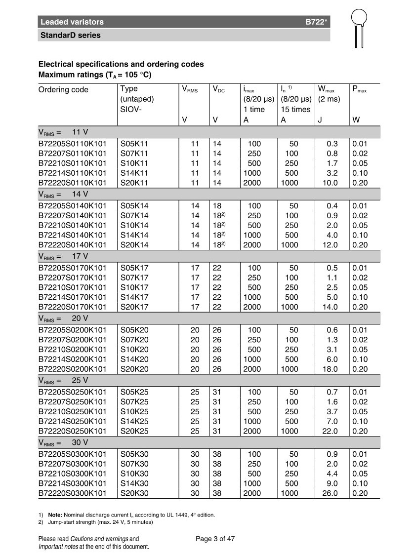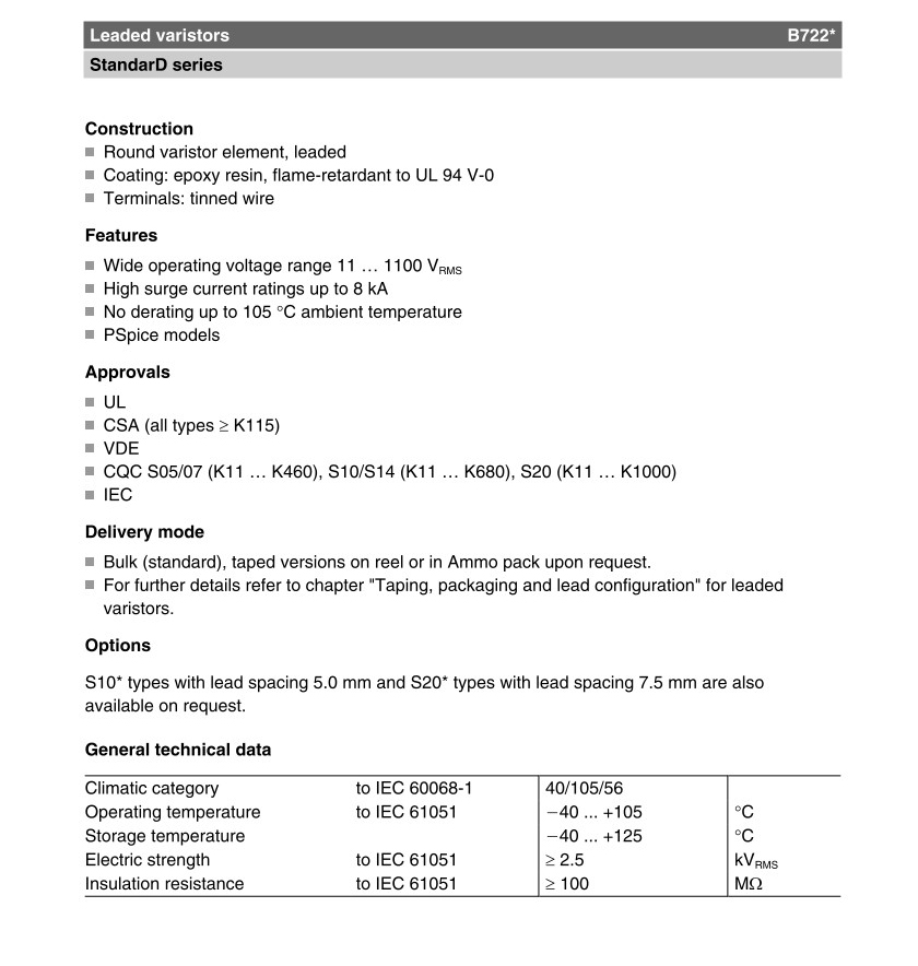 Leaded varistors, StandarD series