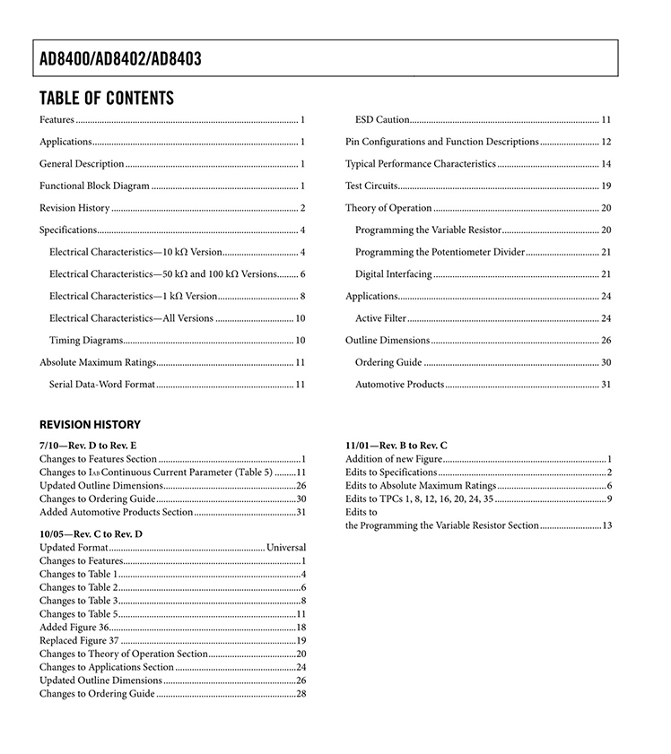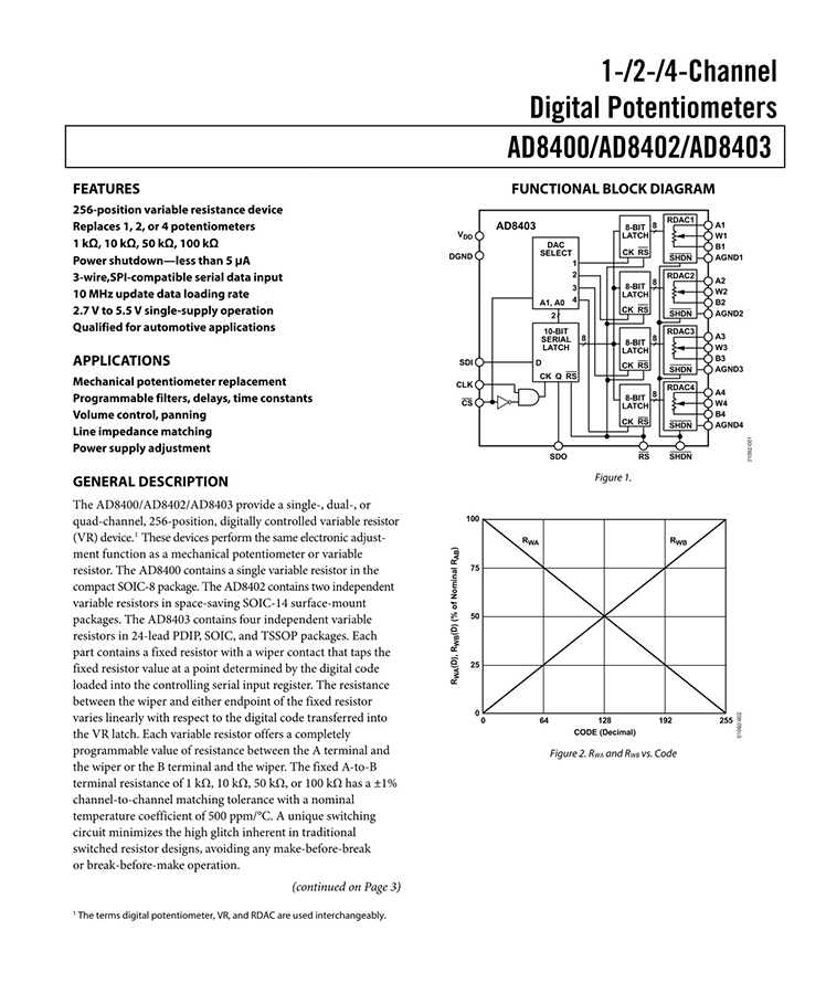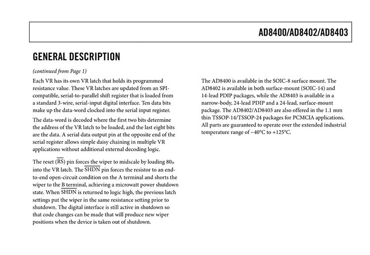 The AD8400/AD8402/AD8403 provide a single-, dual-, or quad-channel, 256-position, digitally controlled variable resistor (VR) device.1 These devices perform the same electronic adjustment function as a mechanical potentiometer or variable resistor. The AD8400 contains a single variable resistor in the compact SOIC-8 package.