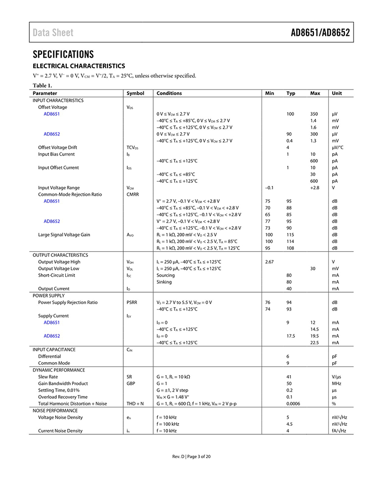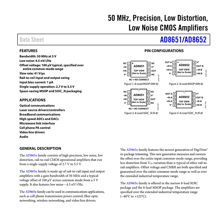 Product Description The AD8651ARMZ is a high precision, low noise, low distortion, rail-to-rail CMOS operational amplifier that operates from a single supply voltage of 2.7 V to 5.5 V. It features a gain bandwidth of 50 MHz and a typical voltage offset of 100 μV across common mode from a 5 V supply. The device utilizes Analog Devices' newest generation of DigiTrim® in-package trimming technology, which measures and corrects the offset over the entire input common-mode range, providing less distortion from VOS variation than is typical of other rail-to-rail amplifiers. |