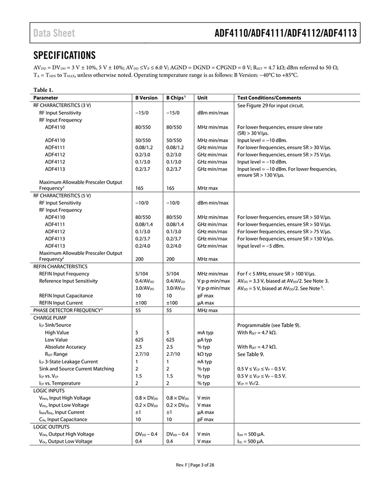 GENERAL DESCRIPTION The ADF4110 family of frequency synthesizers can be used to implement local oscillators in the upconversion and downconversion sections of wireless receivers and transmitters. They consist of a low noise digital PFD (phase frequency detector), a precision charge pump, a programmable reference divider, programmable A and B counters, and a dual-modulus prescaler (P/P + 1). The A (6-bit) and B (13-bit) counters, in conjunction with the dual-modulus prescaler (P/P + 1), implement an N divider (N = BP + A). In addition, the 14-bit reference counter (R counter) allows selectable REFIN frequencies at the PFD input. A complete phase-locked loop (PLL) can be implemented if the synthesizer is used with an external loop filter and voltage controlled oscillator (VCO). FEATURES ADF4110: 550 MHz; ADF4111: 1.2 GHz; ADF4112: 3.0 GHz; ADF4113: 4.0 GHz 2.7 V to 5.5 V power supply Separate charge pump supply (VP) allows extended tuning voltage in 3 V systems Programmable dual-modulus prescaler 8/9, 16/17, 32/33, 64/65 Programmable charge pump currents Programmable antibacklash pulse width 3-wire serial interface Analog and digital lock detect Hardware and software power-down mode APPLICATIONS Base stations for wireless radio (GSM, PCS, DCS, CDMA, WCDMA) Wireless handsets (GSM, PCS, DCS, CDMA, WCDMA) Wireless LANS Communications test equipment CATV equipment |