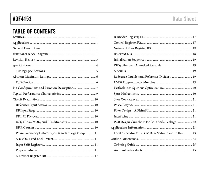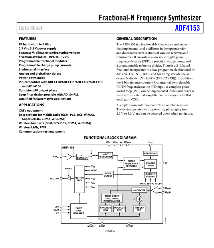 GENERAL DESCRIPTION The ADF4153 is a fractional-N frequency synthesizer that implements local oscillators in the upconversion and downconversion sections of wireless receivers and transmitters. It consists of a low noise digital phase frequency detector (PFD), a precision charge pump, and a programmable reference divider. There is a Σ-Δ based fractional interpolator to allow programmable fractional-N division. The INT, FRAC, and MOD registers define an overall N divider (N = (INT + (FRAC/MOD))). In addition, the 4-bit reference counter (R counter) allows selectable REFIN frequencies at the PFD input. A complete phase-locked loop (PLL) can be implemented if the synthesizer is used with an external loop filter and a voltage controlled oscillator (VCO). FEATURES RF bandwidth to 4 GHz 2.7 V to 3.3 V power supply Separate VP allows extended tuning voltage Y version available: −40°C to +125°C Programmable fractional modulus Programmable charge pump currents 3-wire serial interface Analog and digital lock detect Power-down mode Pin-compatible with ADF4110/ADF4111/ADF4112/ADF4113 and ADF4106 Consistent RF output phase Loop filter design possible with ADIsimPLL Qualified for automotive applications APPLICATIONS CATV equipment Base stations for mobile radio (GSM, PCS, DCS, WiMAX, SuperCell 3G, CDMA, W-CDMA) Wireless handsets (GSM, PCS, DCS, CDMA, W-CDMA) Wireless LANs, PMR Communications test equipment |