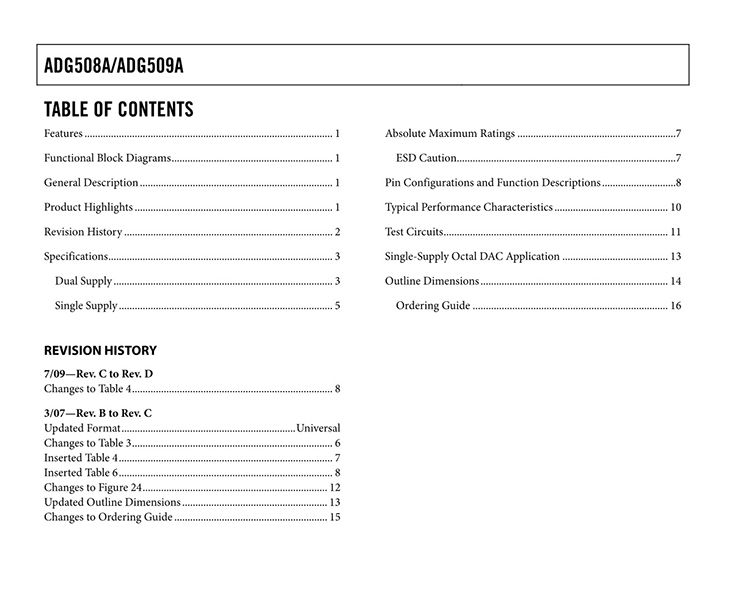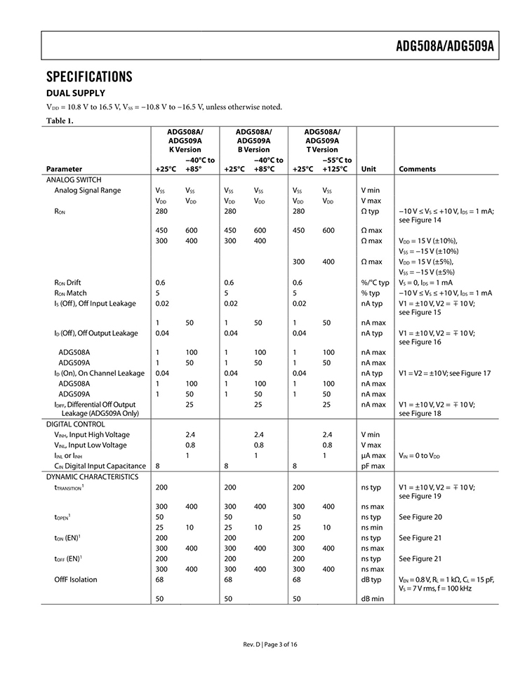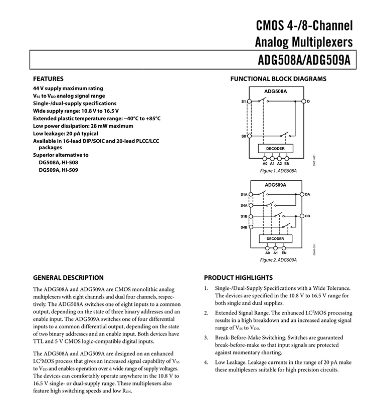 GENERAL DESCRIPTION The ADG508A and ADG509A are CMOS monolithic analog multiplexers with eight channels and dual four channels, respectively. The ADG508A switches one of eight inputs to a common output, depending on the state of three binary addresses and an enable input. The ADG509A switches one of four differential inputs to a common differential output, depending on the state of two binary addresses and an enable input. Both devices have TTL and 5 V CMOS logic-compatible digital inputs. FEATURES 44 V supply maximum rating VSSto VDDanalog signal range Single-/dual-supply specifications Wide supply range: 10.8 V to 16.5 V Extended plastic temperature range: −40°C to +85°C Low power dissipation: 28 mW maximum Low leakage: 20 pA typical Available in 16-lead DIP/SOIC and 20-lead PLCC/LCC packages Superior alternative to DG508A, HI-508 DG509A, HI-509 |