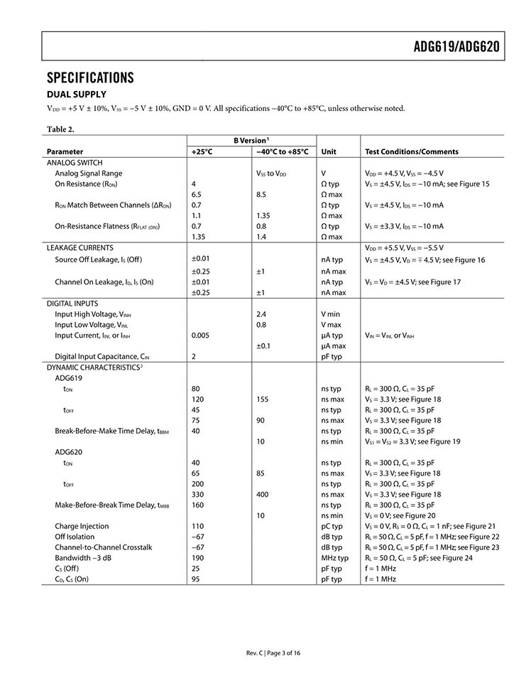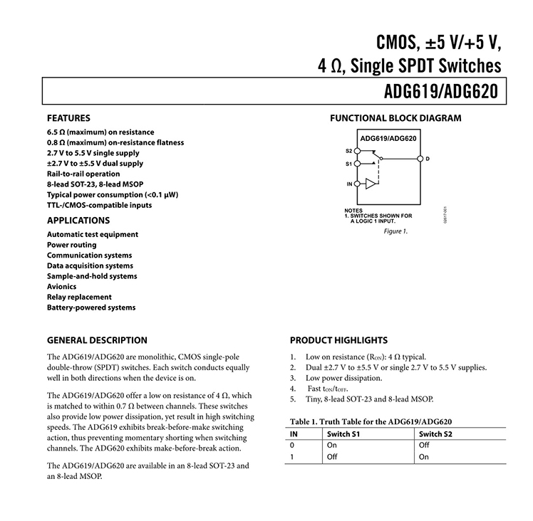 GENERAL DESCRIPTION The ADG619 and the ADG620 are monolithic, CMOS SPDT (single pole, double throw) switches. Each switch conducts equally well in both directions when on. FEATURES 6 Ω (Max) On Resistance 0.8 Ω (Max) On Resistance Flatness 2.7 V to 5.5 V Single Supply ±2.7 V to ±5.5 V Dual Supply Rail-to-Rail Operation 8-Lead SOT-23 Package, 8-Lead MSOP Package Typical Power Consumption (<0.1 μW) TTL/CMOS Compatible Inputs APPLICATIONS Automatic Test Equipment Power Routing Communication Systems Data Acquisition Systems Sample-and-Hold Systems Avionics Relay Replacement Battery-Powered Systems |