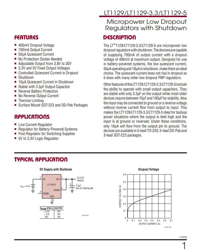 LT1129CST-3.3#PBF Overview The package is delivered in a Bulk case. In order to package the IC voltage regulator, a SOT-223 case is used. This IC Regulator has a type of output called Fixed. There are 1 regulators implemented in this electroic component. At present, it can produce an output of up to 700mA. The regulator has a total of 1 outputs to make sure that it delivers prompt, sufficient outputs. A dropout voltage of 10 volts is what makes it a dropout voltage. Depending on the chip, 3 pins may be available. There is a maximum output current of 700mA for this regulator to meet the operational requirements. It operates in the 50μA Quiescent Current state. As a general rule, it is recommended that you use the IC voltage regulator when temperatures are below 125°C degrees Celsius. At the lowest operating temperature that can be reached by the chip, it is 0°C. In order for it to operate, a supply current of 50μA must be applied. Generally, this voltage regulator IC can output 3.3V volts on a system level. LT1129CST-3.3#PBF Features 400mV dropout voltage The maximum operating temperature of 0°C LT1129CST-3.3#PBF Applications LT1129CST-3.3#PBF Linear Voltage Regulators applications.