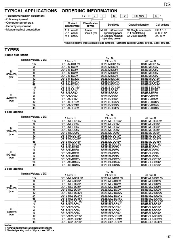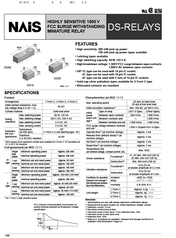DS4E-M-DC24V Description HIGHLY SENSITIVE 1500 V FCC SURGE BREAKDOWN VOLTAGE MINIATURE RELAY DS4E-M-DC24V Features • High sensitivity: 200 mW pick-up power 100 mW pick-up power types available • Latching types available • High switching capacity: 60 W, 125 V A • High breakdown voltage: 1,500 V FCC surge between open contacts 1,000 V AC between open contacts • DIP-1C type can be used with 14 pin IC socket 2C type can be used with 16 pin IC socket, 4C type can be used with 2 sets of 14 pin IC sockets • Gold-cap silver palladium types available for 2 Form C type • Bifurcated contacts are standard DS4E-M-DC24V Applications Besides telecommunications, measuring devices, office equipment, computers and related equipment, DS relays are also recommended for a broad range of applications including business devices, audio systems, and industrial equipment. |
