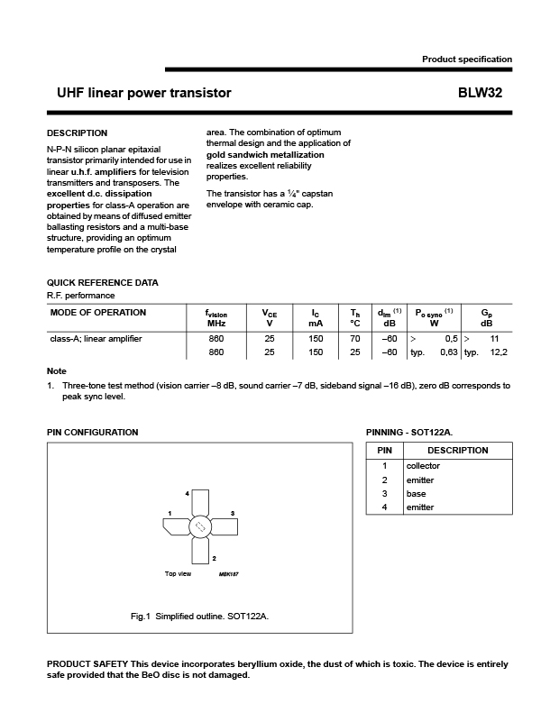 N-P-N silicon planar epitaxial transistor primarily intended for use in linear u.h.f. amplifiers for television transmitters and transposers.
