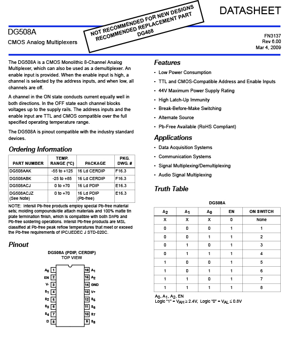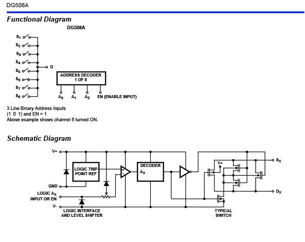 The DG508A is a CMOS Monolithic 8-Channel Analog Multiplexer, which can also be used as a demultiplexer. An enable input is provided. When the enable input is high, a channel is selected by the address inputs, and when low, all channels are off. A channel in the ON state conducts current equally well in both directions. In the OFF state each channel blocks voltages up to the supply rails. The address inputs and the enable input are TTL and CMOS compatible over the full specified operating temperature range. Features • Low Power Consumption • TTL and CMOS-Compatible Address and Enable Inputs • 44V Maximum Power Supply Rating • High Latch-Up Immunity • Break-Before-Make Switching • Alternate Source • Pb-Free Available (RoHS Compliant) Applications • Data Acquisition Systems • Communication Systems • Signal Multiplexing/Demultiplexing • Audio Signal Multiplexing |