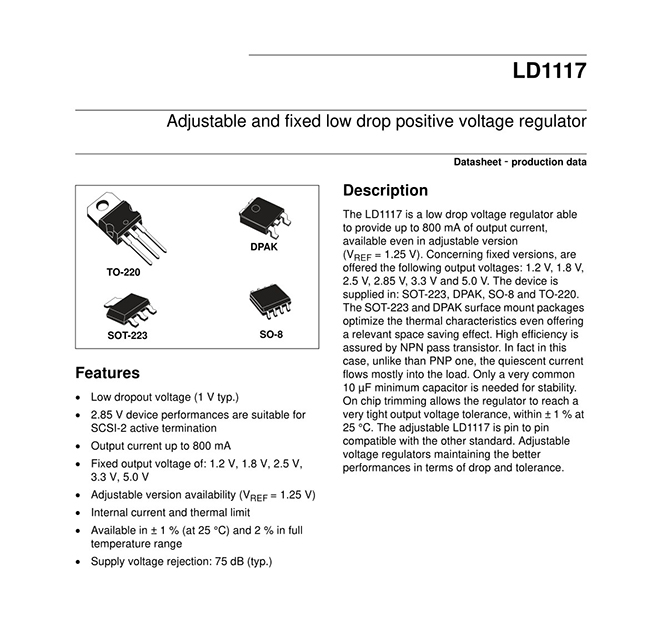 Description The LD1117 is a low drop voltage regulator able to provide up to 800 mA of output current, available even in adjustable version (VREF = 1.25 V). Concerning fixed versions, are offered the following output voltages: 1.2 V, 1.8 V, 2.5 V, 2.85 V, 3.3 V and 5.0 V. The device is supplied in: SOT-223, DPAK, SO-8 and TO-220. The SOT- 223 and DPAK surface mount packages optimize the thermal characteristics even offering a relevant space saving effect. Features • Low dropout voltage (1 V typ.) • 2.85 V device performances are suitable for SCSI-2 active termination • Output current up to 800 mA • Fixed output voltage of: 1.2 V, 1.8 V, 2.5 V, 3.3 V, 5.0 V • Adjustable version availability (VREF = 1.25 V) • Internal current and thermal limit • Available in ± 1 % (at 25 °C) and 2 % in full temperature range • Supply voltage rejection: 75 dB (typ.) |