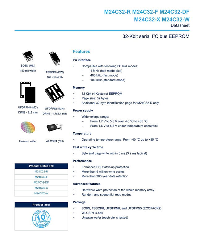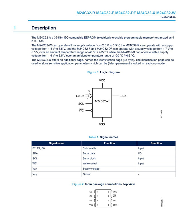 As far as its memory type goes, it falls into the Non-Volatile category. You can get memory ics in a Tube case. 8-SOIC (0.154, 3.90mm Width) case encloses it. There is 32Kb 4K x 8 of memory on the chip. The device uses a mainstream EEPROM-format memory. Suitable for use in a wide range of demanding applications, this device offers an extended operating temperature range of -40°C~85°C TA. There is a voltage range of 2.5V~5.5V for the supply voltage. It is recommended that the mounting type be Surface Mount. There are 8 terminations on the chip. There are 1 functions supported by this part as part of the comprehensive working process. The memory device is designed to be supplied with an 2.7V volt power supply in order to operate properly. It has a clock frequency of 1MHz. When choosing similar parts, M24C32 is frequently referred to as the device's base part number. In this ic memory chip, there is an 8-pin package that encloses the device. It is worth noting that this memory device has 8 pins, which indicates it has 8 memory locations. As a result of the Surface Mount mounting configuration, this chip is designed to be straightforward, high-efficiency, and easy to install. As far as the nominal supply current of this memory component is concerned, it is rated at 5mA. Integrated into this memory is a I2C-type serial bus that facilitates data transmission to the CPU.