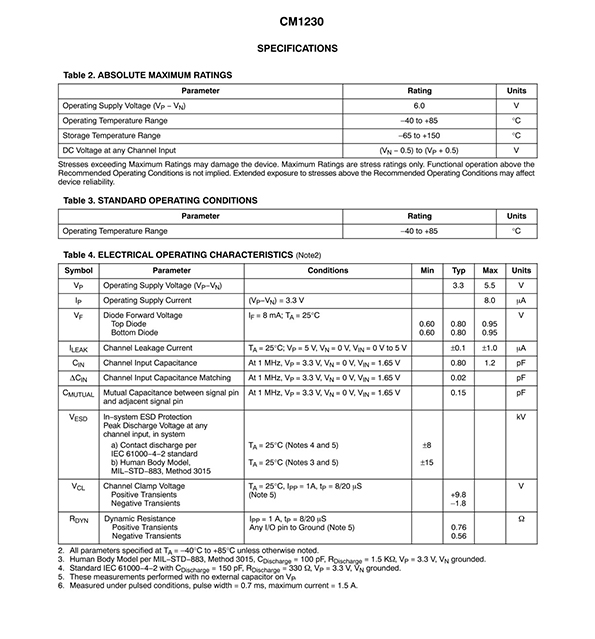 | Product Description The CM1230 is a family of 2, 4 and 8 channel, very low capacitance ESD protection diode arrays in CSP form factor. This device is ideal for protecting systems with high data and clock rates or for circuits that require low capacitive loading. Each channel consists of a pair of ESD diodes that act as clamp diodes that steer positive or negative ESD current pulses to either the positive or negative supply rail. A zener diode is integrated into the array between the positive and negative supply rails. The VCC rail is thus protected from ESD strikes and eliminates the need for a bypass capacitor to absorb positive ESD strikes to ground. Features • 2, 4 and 8 channels of ESD protection • Provides ESD protection to IEC61000-4-2 Level 4 • ±8kV contact discharge • ±15kV air discharge • Low loading capacitance of 0.8pF typical • Minimal capacitance change with temperature and voltage • Channel I/O to GND capacitance difference of 0.02pF typical is ideal for differential signals • Channel I/O to I/O capacitance 0.15pF typical • Zener diode protects supply rail and eliminates the need for external by-pass capacitors • Each I/O pin can withstand over 1000 ESD strikes • Available in 4, 6 and 10 bump Chip Scale Packages (CSP) • OptiGuard™ coated for improved reliability at assembly • Lead-free version available Applications • LCD and Camera data lines in wireless handsets that use high-speed serial interfaces. • I/O port protection for mobile handsets, notebook computers, DSCs, MP3 players, PDAs, etc. including USB, 1394 and Serial ATA • Wireless handsets • Handheld PCs/PDAs • LCD and camera modules |