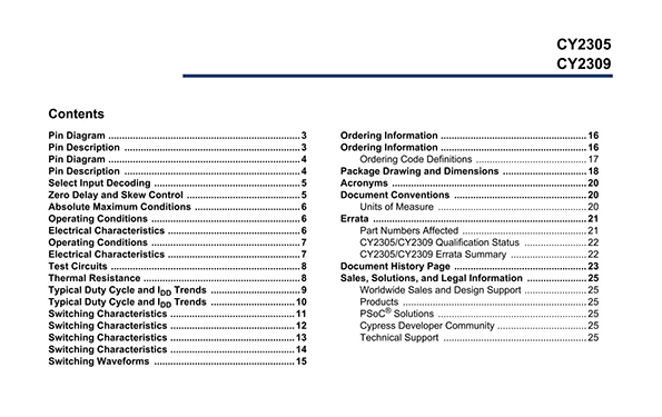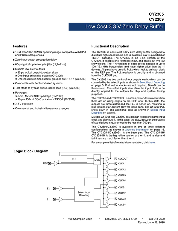 Functional Description The CY2309 is a low-cost 3.3-V zero delay buffer designed to distribute high speed clocks and is available in a 16-pin SOIC or TSSOP package. The CY2305 is an 8-pin version of the CY2309. It accepts one reference input, and drives out five low skew clocks. The -1H versions of each device operate at up to 100-/133 MHz frequencies, and have higher drive than the -1 devices. All parts have on-chip PLLs which lock to an input clock on the REF pin. The PLL feedback is on-chip and is obtained from the CLKOUT pad. Features ■ Not recommended for new designs. The CY2305C and CY2309C are form, fit, function compatible devices with improved specifications. ■ 10 MHz to 100/133 MHz operating range, compatible with CPU and PCI bus frequencies ■ Zero input-output propagation delay ■ 60-ps typical cycle-to-cycle jitter (high drive) ■ Multiple low skew outputs ❐ 85 ps typical output-to-output skew ❐ One input drives five outputs (CY2305) ❐ One input drives nine outputs, grouped as 4 + 4 + 1 (CY2309) ■ Compatible with Pentium-based systems ■ Test Mode to bypass phase-locked loop (PLL) (CY2309) ■ Packages: ❐ 8-pin, 150-mil SOIC package (CY2305) ❐ 16-pin 150-mil SOIC or 4.4-mm TSSOP (CY2309) ■ 3.3-V operation ■ Commercial and industrial temperature ranges |