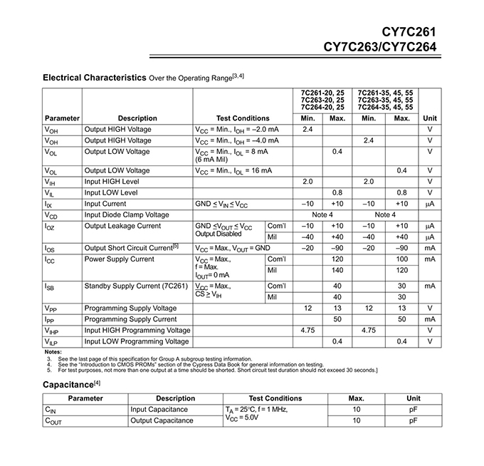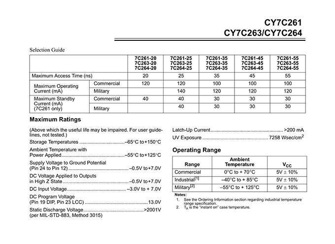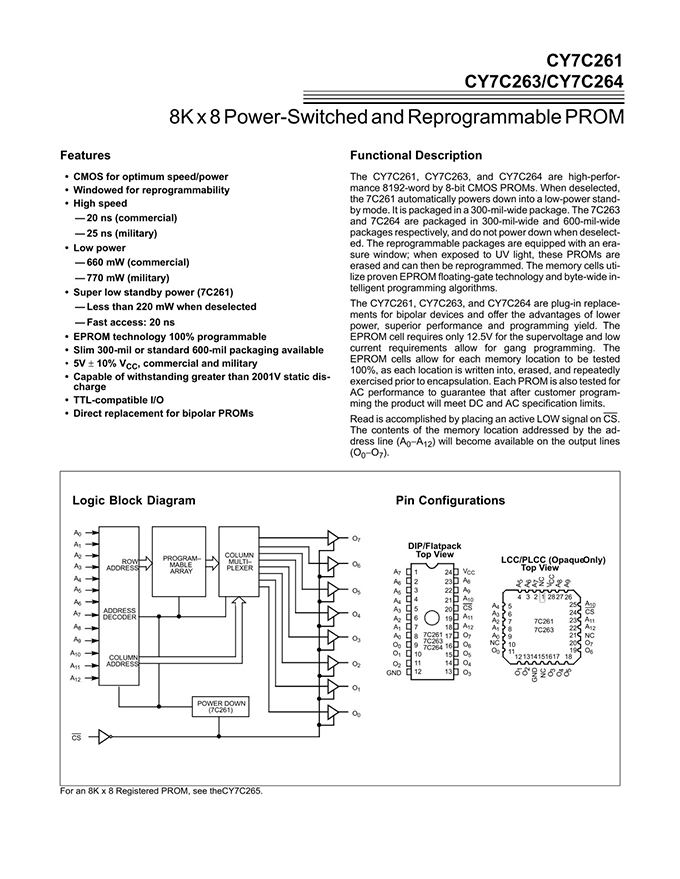 Functional Description The CY7C261, CY7C263, and CY7C264 are high-performance 8192-word by 8-bit CMOS PROMs. When deselected, the CY7C261 automatically powers down into a low-power standby mode. It is packaged in a 300-mil-wide package. The CY7C263 and CY7C264 are packaged in 300-mil-wide and 600-mil-wide packages respectively, and do not power down when deselected. The reprogrammable packages are equipped with an erasure window; when exposed to UV light, these PROMs are erased and can then be reprogrammed. The memory cells utilize proven EPROM floating-gate technology and byte-wide intelligent programming algorithms. Features • CMOS for optimum speed/power • Windowed for reprogrammability • High speed — 20 ns (Commercial) — 25 ns (Military) • Low power — 660 mW (Commercial) — 770 mW (Military) • Super low standby power (7C261) — Less than 220 mW when deselected — Fast access: 20 ns • EPROM technology 100% programmable • Slim 300-mil or standard 600-mil packaging available • 5V ± 10% VCC, commercial and military • Capable of withstanding greater than 2001V static discharge • TTL-compatible I/O • Direct replacement for bipolar PROMs |
